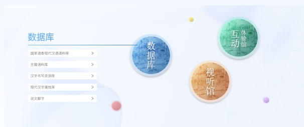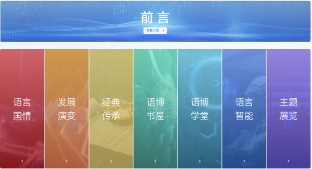 根據(jù)語言文字特點(diǎn)及其文化特征,語博一期建設(shè)分為語言國情、發(fā)展演變、經(jīng)典傳承、語博書屋、語博學(xué)堂、語言智能、主題展覽7個(gè)主體版塊,以及數(shù)據(jù)庫、視聽館、互動(dòng)體驗(yàn)館3個(gè)資源模塊,橫縱交叉、立體展示。