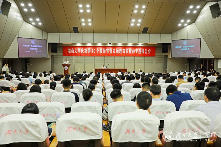 第40個教師節(jié)即將來臨,為大力弘揚(yáng)教育家精神,引導(dǎo)廣大教師從理想信念、道德情操、育人智慧、躬耕態(tài)度、仁愛之心、弘道追求等六個方面深刻理解和踐行教育家精神,9月6日上午,湖南大學(xué)舉行慶祝第40個教師節(jié)暨弘揚(yáng)教育家精神專題報告會。報告會由中國工程院院士、土木工程學(xué)院教授、2023年度國家技術(shù)發(fā)明獎一等獎獲得者、第二批“全國高校黃大年式教師團(tuán)隊”負(fù)責(zé)人、2024年“湖南省教書育人楷?!碧貏e人選獲得者陳政清主講。校黨委副書記唐珍名主持報告會。
