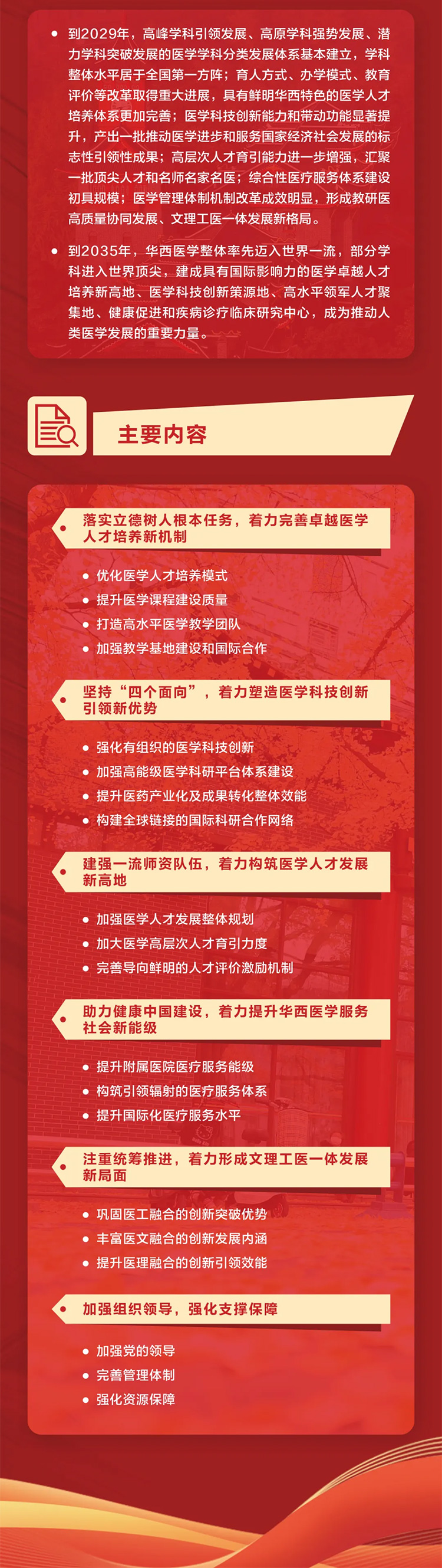 會(huì)議明確了加快推動(dòng)華西醫(yī)學(xué)整體率先邁入世界一流的總體要求,強(qiáng)調(diào)要錨定一流目標(biāo),以服務(wù)國(guó)家戰(zhàn)略為導(dǎo)向,以高質(zhì)量發(fā)展為內(nèi)核,以學(xué)科建設(shè)為牽引,以全面深化改革為動(dòng)力,推動(dòng)華西醫(yī)學(xué)高質(zhì)量發(fā)展。到2029年,形成教研醫(yī)高質(zhì)量協(xié)同發(fā)展、文理工醫(yī)一體發(fā)展新格局,華西醫(yī)學(xué)整體水平居于全國(guó)第一方陣;到2035年,華西醫(yī)學(xué)整體率先邁入世界一流,成為推動(dòng)人類醫(yī)學(xué)發(fā)展的重要力量,為以中國(guó)式現(xiàn)代化全面推進(jìn)中華民族偉大復(fù)興作出川大新的貢獻(xiàn)。