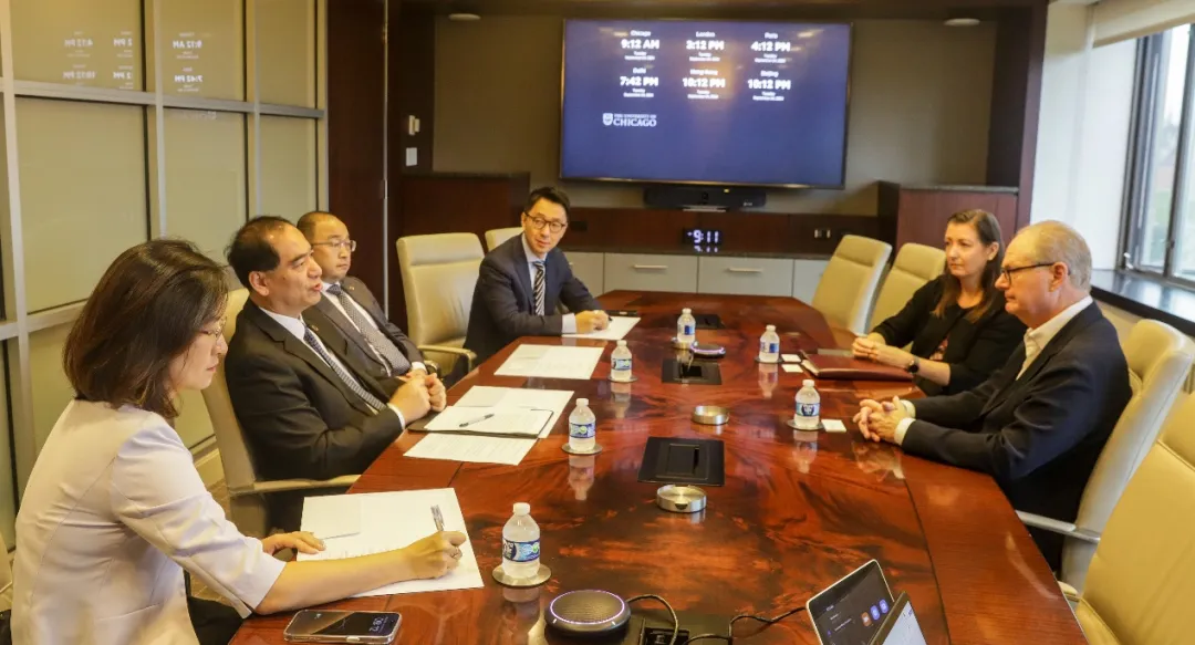 訪問芝加哥大學期間,芝加哥大學校長保羅·阿利維薩托斯(Paul Alivisatos)會見代表團一行。龔旗煌感謝芝加哥大學對2024年中美頂尖大學“10+10”校長論壇給予的鼎力支持,并回顧了兩校在教學科研、人才培養(yǎng)等領域的密切合作。龔旗煌表示,芝加哥大學北京中心及北京大學芝加哥中心在促進兩校深度合作方面具有標志性意義,希望未來兩校在學生聯(lián)合培養(yǎng)、科學研究等領域開展更加廣泛的合作。阿利維薩托斯歡迎龔旗煌一行訪問芝加哥大學,并介紹了芝加哥大學海外中心在人才培養(yǎng)領域發(fā)揮的重要作用。他希望在已有合作基礎上,進一步深化兩校合作。