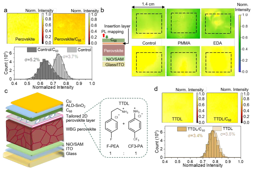 圖1. 寬帶隙鈣鈦礦中界面均一化策略的提出。a, C??沉積前后鈣鈦礦表面的光致發(fā)光圖與強(qiáng)度分布;b, 含有不同插入層的鈣鈦礦堆疊的光致發(fā)光圖像;c, 定制的二維鈣鈦礦策略示意圖;d, 含定制的二維鈣鈦礦插入層的C??沉積前后鈣鈦礦表面的光致發(fā)光圖與強(qiáng)度分布。