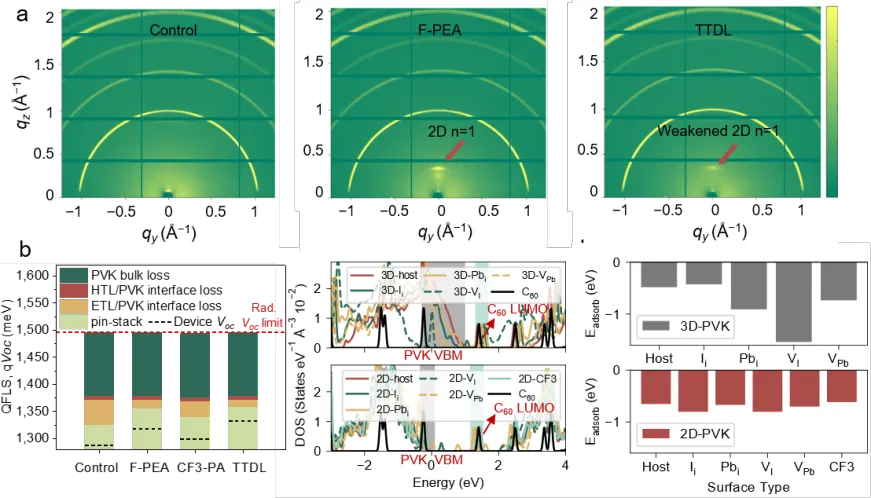 圖2. 定制的二維鈣鈦礦的作用機(jī)制。a, 不同后處理分子的鈣鈦礦表面GI-WAXs圖譜;b, 含有不同插入層的鈣鈦礦堆疊中的性能損失分析;c, 二維鈣鈦礦與三維鈣鈦礦表面的能級(jí)分析;d, 含不同點(diǎn)缺陷的二維鈣鈦礦與三維鈣鈦礦表面與C??的吸附能分析。