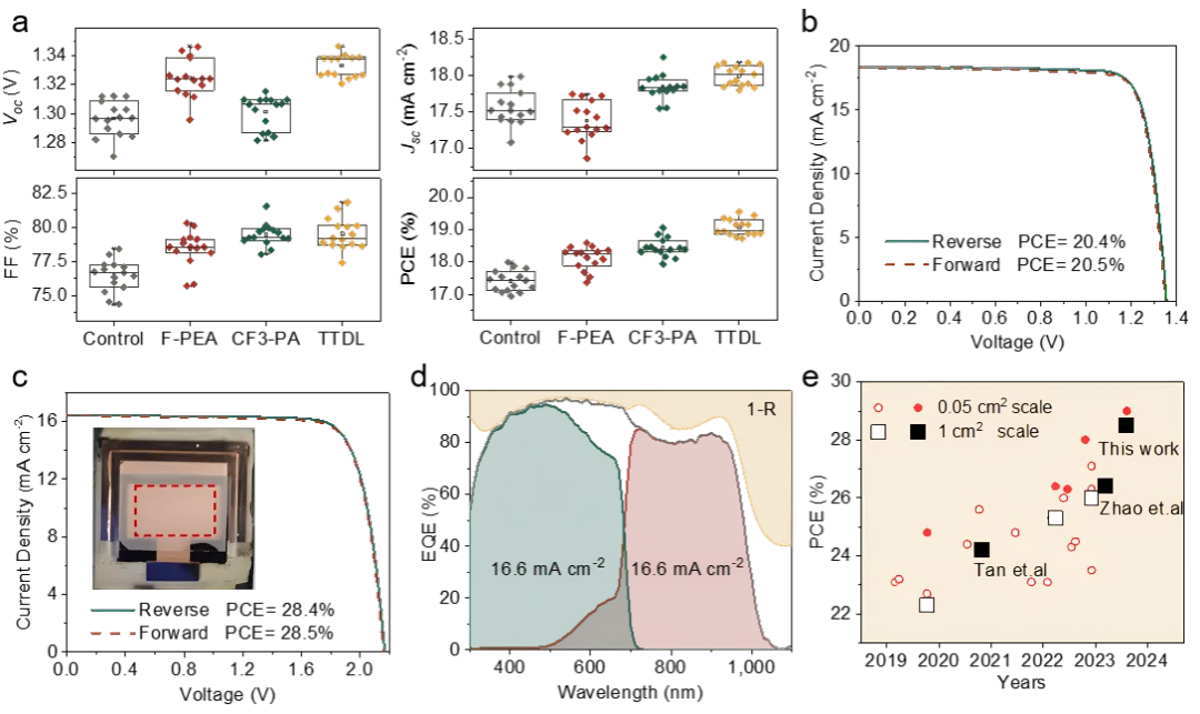 研究團(tuán)隊(duì)進(jìn)一步地將優(yōu)化后的寬帶隙鈣鈦礦用于制備全鈣鈦礦疊層太陽(yáng)電池。在活性區(qū)域?yàn)?.05 cm2的全鈣鈦礦疊層太陽(yáng)電池中,實(shí)現(xiàn)了28.5%的轉(zhuǎn)化效率(如圖3c所示)。EQE顯示的匹配電流為16.6 mA cm?2,與當(dāng)前最佳的小面積全鈣鈦礦疊層太陽(yáng)電池的數(shù)值相當(dāng),意味著在面積擴(kuò)大時(shí)沒(méi)有發(fā)生明顯的電流損失(如圖3d所示)。