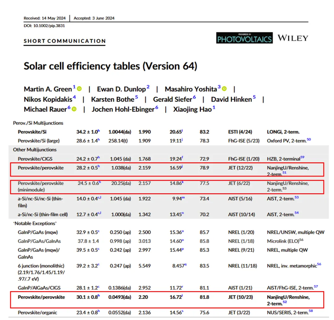 圖4. 最新太陽(yáng)能電池世界紀(jì)錄效率表(疊層電池部分)。《Solar cell efficiency tables》是由“太陽(yáng)能之父”Martin Green教授與美、日、意、澳等多國(guó)科學(xué)家聯(lián)合編撰的國(guó)際權(quán)威榜單,代表了全球光伏領(lǐng)域的最前沿水平。