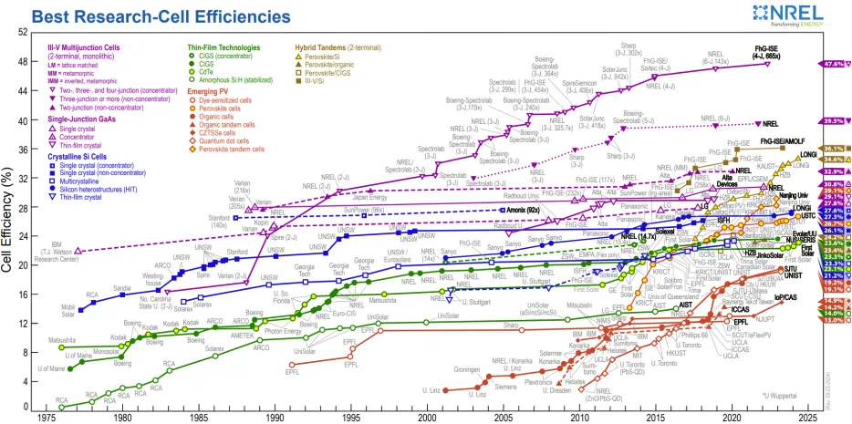 圖5.美國(guó)國(guó)家可再生能源實(shí)驗(yàn)室發(fā)布的“最佳太陽(yáng)電池效率”表。