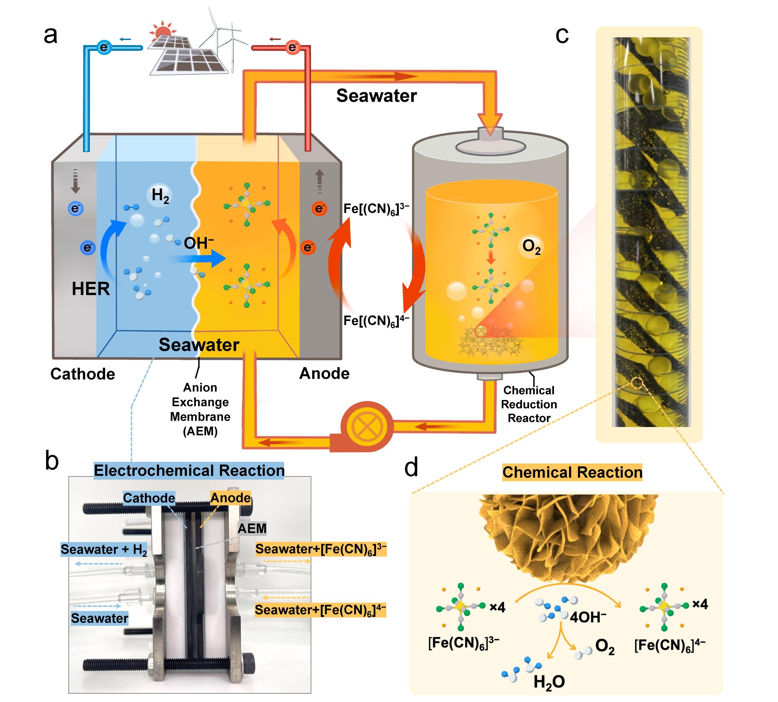 不同于2022年11月謝和平院士團隊Nature正刊上提出的相變遷移海水直接電解制氫顛覆性原理技術(shù),該研究是謝和平院士團隊圍繞海水中的氯離子引發(fā)副反應和電極腐蝕現(xiàn)象,提出的另一種新的解耦式海水直接電解制氫策略。論文系統(tǒng)研究了鐵氰酸根/亞鐵氰酸根電對([Fe(CN)6]3?/4?)在真實海水體系下可逆氧化還原特性,探明了電解系統(tǒng)陰極析氫反應與陽極亞鐵氰酸根氧化反應的高效性,厘清了解耦體系下氧氣自發(fā)穩(wěn)定產(chǎn)出的反應機理,實現(xiàn)了全新系統(tǒng)在真實海水環(huán)境下250小時的長時間穩(wěn)定。該項原理技術(shù)巧妙規(guī)避了海水中氯離子對電解制氫反應的干擾,充分驗證了解耦式海水直接電解制氫系統(tǒng)在復雜海水環(huán)境下的抗腐蝕性與對氯離子副反應的應用潛力,將有助于豐富和進一步構(gòu)建破解海水復雜成分影響的海水電解制氫理論體系和技術(shù)框架。