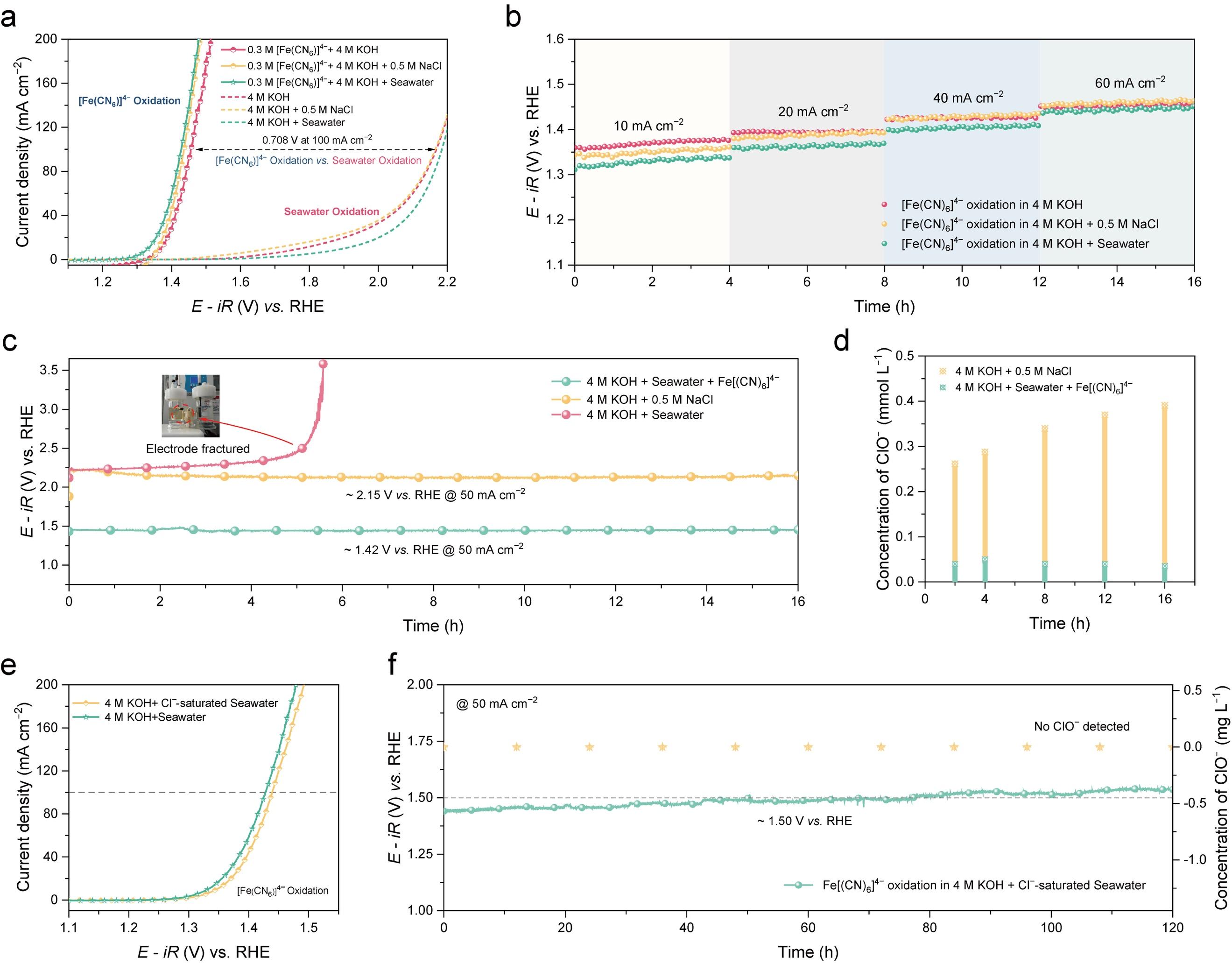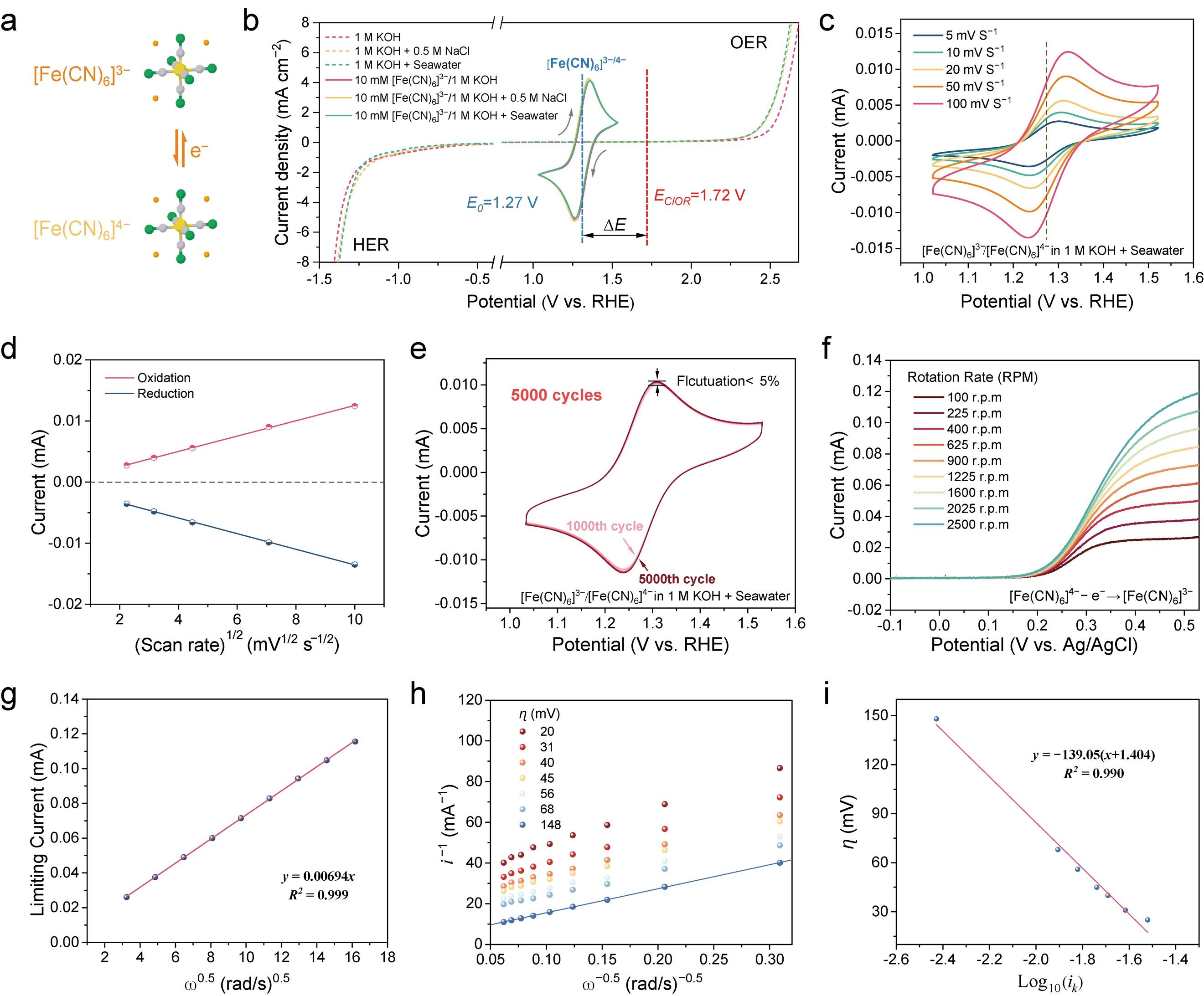 該研究針對海水制氫中最棘手的氯離子干擾難題,引入氧化還原介導的解耦策略,利用兼具熱力學和動力學優(yōu)勢的陽極反應,巧妙規(guī)避了傳統(tǒng)電解水制氫過程中析氧反應與氯離子反應的直接競爭,大幅降低了電化學腐蝕。在該研究中,[Fe(CN)6]3?/4?電對在在海水中不僅保持了優(yōu)異的可逆氧化還原動力學特性,而且在200 mA cm?2的接近工業(yè)級電流密度下實現(xiàn)了超過250小時的長時間穩(wěn)定運行。