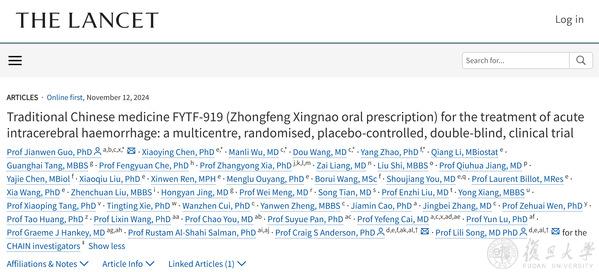 在這項題為“Traditional Chinese medicine FYTF-919 (Zhongfeng Xingnao oral prescription) for the treatment of acute intracerebral haemorrhage: a multicentre, randomised, placebo-controlled, double-blind, clinical trial”(《中醫(yī)藥FYTF919治療急性腦出血:一項多中心隨機、安慰劑對照的雙盲臨床研究》)的研究中,研究人員發(fā)現(xiàn),“中風醒腦方”在整體上未對急性腦出血患者的臨床預后產(chǎn)生顯著改善,但在特定群體——皮層出血和中等以上出血患者中,顯示出潛在效果(有待進一步驗證)。