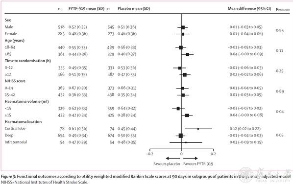 研究結果顯示,試驗組和安慰劑組在90天UW-mRS的平均值上所差無幾,各項敏感性分析結果均一致,在亞組分析上,治療效果在血腫體積和血腫位置方面展現(xiàn)出了顯著異質性。