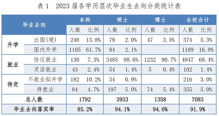 報告顯示,2023屆畢業(yè)生中4949人直接就業(yè),占畢業(yè)生總數(shù)的69.9%。其中,本科畢業(yè)生直接就業(yè)173 人,占本科畢業(yè)生總數(shù)的9.7%;碩士畢業(yè)生直接就業(yè)3539人,占碩士畢業(yè)生總數(shù)的90.0%;博士畢業(yè)生直接就業(yè)1237人,占博士畢業(yè)生總數(shù)的 91.1%。