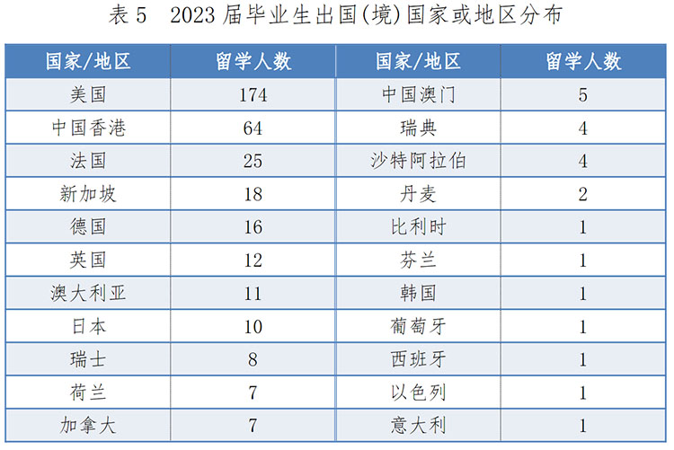 出國(境)留學374人,其中本科生出國(境)留學248人,占本科畢業(yè)生總?cè)藬?shù)的13.9%;研究生出國(境)留學126人,占畢業(yè)研究生總?cè)藬?shù)的2.4%。出國(境)留學的本科畢業(yè)生中75%以上獲國外獎學金資助。留學去向分布于全球 22 個國家或地區(qū),其中,赴美國留學人數(shù)最多,占出國(境)總?cè)藬?shù)的 46.5%,其次為中國香港(17.1%)、法國(6.7%)、新加坡(4.8%)等。