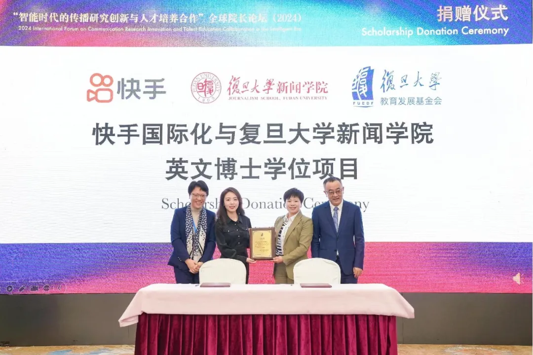 11月24日,由復(fù)旦大學(xué)新聞學(xué)院主辦的“智能時(shí)代的傳播研究創(chuàng)新與人才培養(yǎng)合作”全球院長論壇在復(fù)旦大學(xué)召開。論壇開幕式上舉行了快手國際化——復(fù)旦大學(xué)新聞學(xué)院英文博士項(xiàng)目獎(jiǎng)學(xué)金捐贈(zèng)儀式。復(fù)旦大學(xué)對外聯(lián)絡(luò)與發(fā)展處副處長、上海復(fù)旦大學(xué)教育發(fā)展基金會(huì)副秘書長林晶晶向快手國際化事業(yè)部人力資源高級總監(jiān)徐康楠頒發(fā)捐贈(zèng)牌。