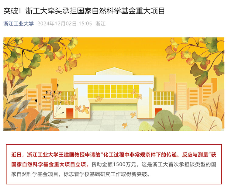 浙江工業(yè)大學(xué)王建國教授申請的“化工過程中非常規(guī)條件下的傳遞、反應(yīng)與測量”獲國家自然科學(xué)基金重大項(xiàng)目立項(xiàng),資助金額1500萬元,這是浙工大首次承擔(dān)該類型的國家自然科學(xué)基金項(xiàng)目,標(biāo)志著學(xué)校基礎(chǔ)研究工作取得新突破……>>查看詳情
