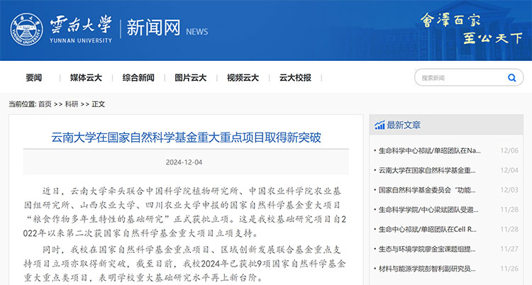 云南大學(xué)牽頭聯(lián)合中國科學(xué)院植物研究所、中國農(nóng)業(yè)科學(xué)院農(nóng)業(yè)基因組研究所、山西農(nóng)業(yè)大學(xué)、四川農(nóng)業(yè)大學(xué)申報(bào)的國家自然科學(xué)基金重大項(xiàng)目“糧食作物多年生特性的基礎(chǔ)研究”正式獲批立項(xiàng)。這是云南大學(xué)基礎(chǔ)研究項(xiàng)目自2022年以來第二次獲國家自然科學(xué)基金重大項(xiàng)目立項(xiàng)支持?!?a href="http://www.wethreecreatives.com/news/dongtai/202412/t20241209_2645417.shtml">>>查看詳情
