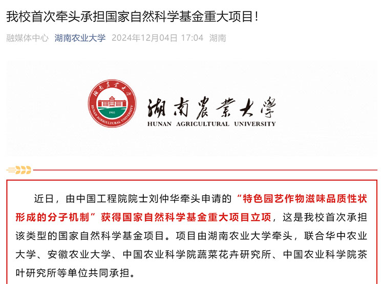由中國工程院院士劉仲華牽頭申請的“特色園藝作物滋味品質(zhì)性狀形成的分子機(jī)制”獲得國家自然科學(xué)基金重大項(xiàng)目立項(xiàng),這是湖南農(nóng)業(yè)大學(xué)首次承擔(dān)該類型的國家自然科學(xué)基金項(xiàng)目。項(xiàng)目由湖南農(nóng)業(yè)大學(xué)牽頭,聯(lián)合華中農(nóng)業(yè)大學(xué)、安徽農(nóng)業(yè)大學(xué)、中國農(nóng)業(yè)科學(xué)院蔬菜花卉研究所、中國農(nóng)業(yè)科學(xué)院茶葉研究所等單位共同承擔(dān)……>>查看詳情