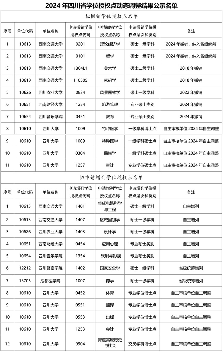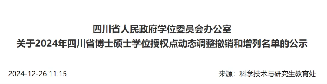 近日,四川省組織開展了2024年博士碩士學(xué)位授權(quán)學(xué)科和專業(yè)學(xué)位授權(quán)類別動態(tài)調(diào)整工作,四川省人民政府學(xué)位委員會辦公室對2024年四川省博士碩士學(xué)位授權(quán)點(diǎn)動態(tài)調(diào)整撤銷和增列名單進(jìn)行公示。