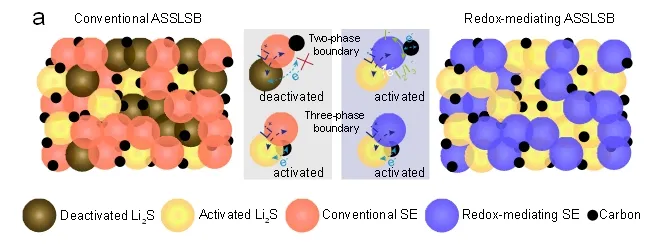 圖1. 傳統(tǒng)全固態(tài)鋰硫電池的問題及本研究的快速固固硫轉(zhuǎn)化反應機制。