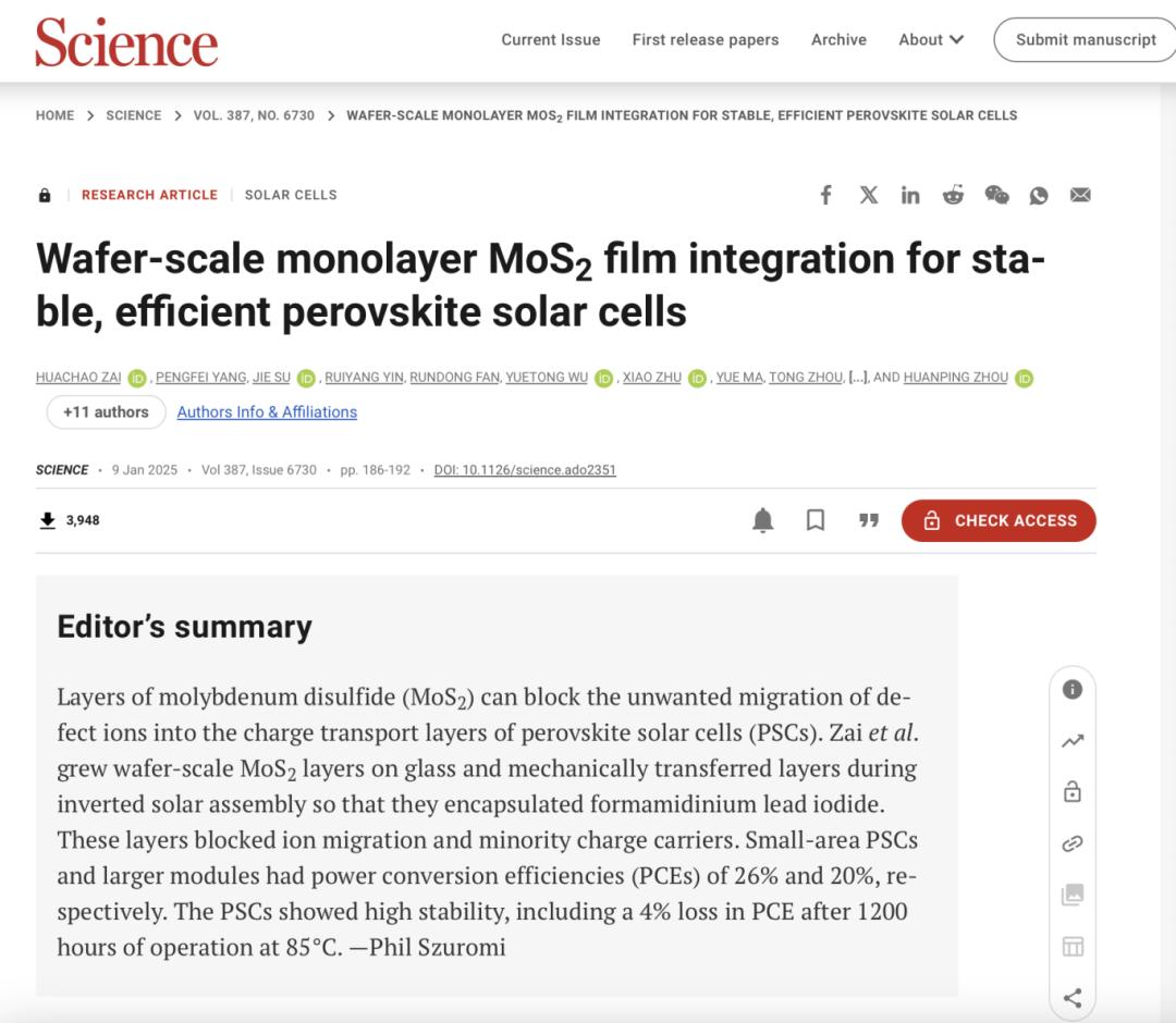 1月9日,北京大學(xué)周歡萍教授、張艷鋒教授(共同通訊作者)在Science上發(fā)表了題為“Wafer-scale monolayer MoS2 film integration for stable, efficient perovskite solar cells”(晶圓級單層MoS2薄膜集成實(shí)現(xiàn)穩(wěn)定、高效的鈣鈦礦太陽能電池)的研究論文。