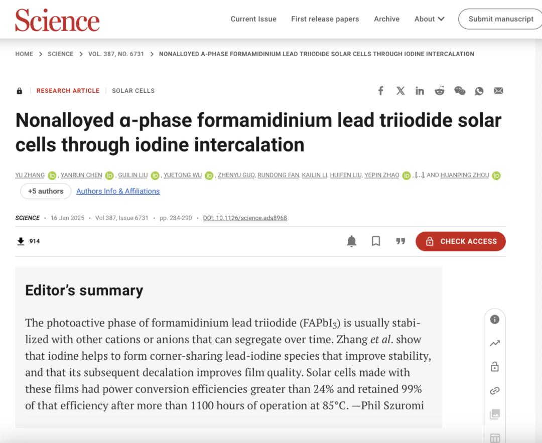 1月16日,周歡萍教授為獨(dú)立通訊作者,再度在Science發(fā)表了題為“Nonalloyed α-phase formamidinium lead triiodide solar cells through iodine intercalation”(通過碘嵌入制備非合金α-FAPbI3太陽能電池)的研究論文。這是Science期刊在一周之內(nèi)連續(xù)兩次刊發(fā)周歡萍團(tuán)隊(duì)在鈣鈦礦太陽能電池領(lǐng)域的研究進(jìn)展。