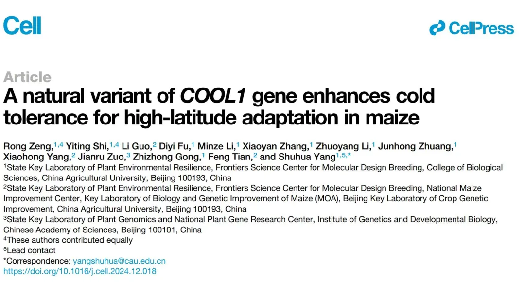 近日,中國農(nóng)業(yè)大學(xué)生物學(xué)院植物抗逆高效全國重點實驗室楊淑華課題組在Cell雜志在線發(fā)表了題為A natural variant of COOL1 gene enhances cold tolerance for high latitude adaptation in maize的研究論文。該研究首次揭示了玉米適應(yīng)高緯度低溫環(huán)境的分子機制,發(fā)現(xiàn)玉米COOL1基因的自然變異通過增強低溫耐受性,促進其適應(yīng)高緯度環(huán)境。這一發(fā)現(xiàn)彌補了關(guān)于玉米適應(yīng)高緯度低溫環(huán)境的知識空白,并為高緯度地區(qū)玉米的種植提供了新的分子育種策略。