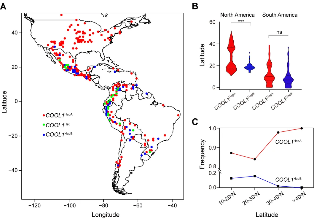 為了探究COOL1基因的進化起源,研究團隊對59種不同大芻草中COOL1啟動子區(qū)域進行了測序。結(jié)果顯示,超過一半的大芻草攜帶耐冷等位基因COOL1HapA,表明這一等位變異在野生種群體中就已存在。進一步對1,008份前哥倫布時期遍布美洲大陸的玉米地方品種進行基因分型,發(fā)現(xiàn)COOL1HapA耐冷等位基因主要分布于北部高緯度寒冷地區(qū),并在北美地區(qū)固定,而COOL1HapB冷敏感等位基因則更常見于低緯度溫暖地區(qū)。這表明,COOL1的耐冷等位基因在促進玉米適應(yīng)高緯度低溫氣候過程中起到了重要作用(圖2)。研究還指出,我國一些主栽玉米品種(如先玉335、鄭單958等)的部分親本攜帶COOL1冷敏感等位基因。值得一提的是,在正常環(huán)境條件下,COOL1功能缺失突變體的產(chǎn)量相關(guān)性狀并未表現(xiàn)出顯著變化。因此,COOL1耐冷等位基因在提升玉米耐冷性、拓展其高緯度種植范圍方面具有顯著的應(yīng)用潛力。