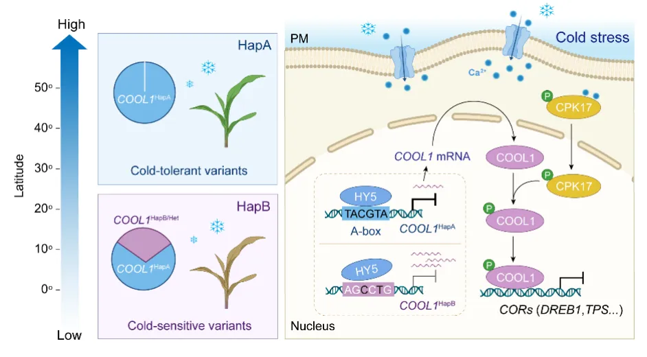 進一步研究發(fā)現(xiàn),COOL1啟動子區(qū)的4個顯著自然變異位點位于A-box基序,這一基序受光信號關(guān)鍵轉(zhuǎn)錄因子HY5的調(diào)控。在低溫環(huán)境下,HY5表達水平顯著上升,通過抑制COOL1基因的表達,正向調(diào)控玉米的耐冷性。COOL1啟動子的自然變異影響了HY5對其啟動子區(qū)的結(jié)合能力,從而導(dǎo)致了COOL1HapA和COOL1HapB耐冷性差異。進一步研究還表明,COOL1的蛋白穩(wěn)定性受到鈣依賴蛋白激酶CPK17的調(diào)控。低溫激活CPK17激酶活性,促使其從細胞質(zhì)進入細胞核,磷酸化COOL1,從而增強COOL1蛋白穩(wěn)定性,負向調(diào)控玉米的耐冷性。