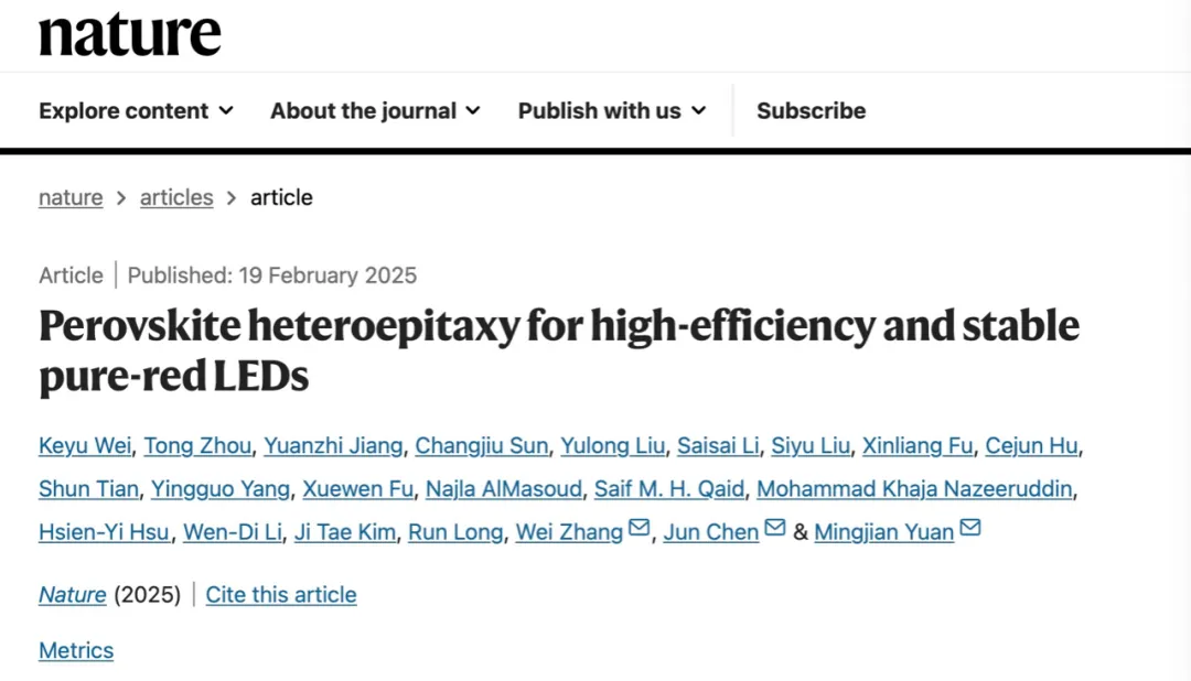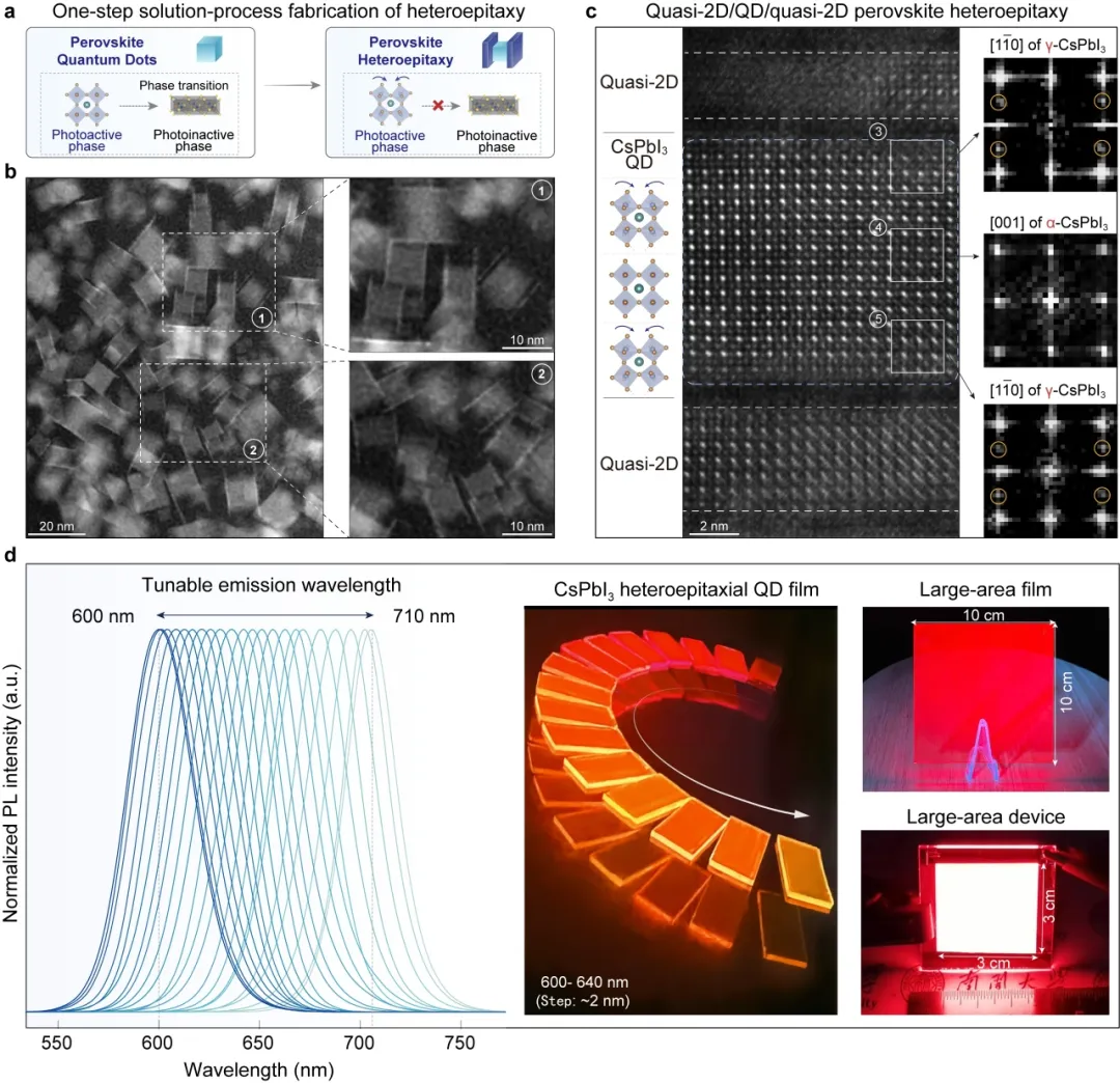 該研究題為“Perovskite heteroepitaxy for high-efficiency and stable pure-red LEDs”。團(tuán)隊(duì)針對(duì)新型鈣鈦礦超高清顯示技術(shù)中純紅光CsPbI3鈣鈦礦量子點(diǎn)材料相穩(wěn)定性差這一世界難題,率先提出“外延異質(zhì)結(jié)界面應(yīng)力操控”策略,首次利用全溶液法實(shí)現(xiàn)鈣鈦礦范德華外延異質(zhì)結(jié)的大面積原位可控制備,成功突破材料穩(wěn)定性與器件性能雙重瓶頸,研發(fā)出高效率與高穩(wěn)定性兼?zhèn)涞募兗t光鈣鈦礦電致發(fā)光器件 (LED),為下一代超高清顯示技術(shù)發(fā)展提供了關(guān)鍵技術(shù)支撐,標(biāo)志著在該領(lǐng)域的重大技術(shù)突破。