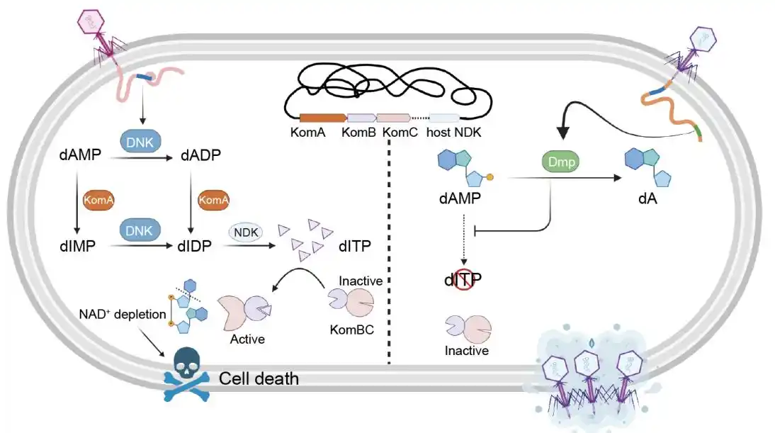 在微觀世界里,細菌與病毒之間每天都在上演著攻防大戰(zhàn)。生物體內的信號傳遞如同精密的通信網絡,而核苷酸分子長期被認為是關鍵的“信號兵”。自1950年代發(fā)現環(huán)狀核苷酸(如cAMP、cGMP)以來,科學家已解析了其在代謝調節(jié)、免疫應答中的核心作用,相關研究多次獲得諾貝爾獎。不同于環(huán)狀核苷酸的免疫作用,非典型核苷酸在過去普通被認為不發(fā)揮任何生理作用。然而,研究團隊通過基因分析,鎖定了一個由KomA(孔明A)、KomB(孔明B)、KomC(孔明C)三個蛋白組成的防御系統。當噬菌體入侵時,其攜帶的脫氧核苷酸激酶(DNK)意外成為激活細菌免疫的“開關”:KomA與DNK協作,將核苷酸(dAMP)轉化為特殊信號分子dITP。這種分子能觸發(fā)KomC蛋白分解細胞內的關鍵物質NAD?,導致噬菌體因“能源枯竭”無法復制。令人稱奇的是,該系統巧妙利用入侵者攜帶的酶完成防御,正如三國時期諸葛亮“草船借箭”的智謀,因此被命名為“孔明系統”。這種堿基修飾核苷酸的信號傳導模式突破了環(huán)狀核苷酸作為信號分子的經典理論體系,首次證實非典型核苷酸同樣具有免疫調控功能。