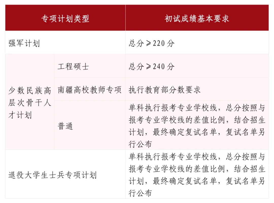 符合少數(shù)民族照顧政策(工作單位和戶籍在國(guó)務(wù)院公布的民族區(qū)域自治地方,且定向就業(yè)單位為原單位的少數(shù)民族在職人員)并已按規(guī)定申報(bào)的考生,按照教育部規(guī)定的初試成績(jī)要求進(jìn)入復(fù)試。