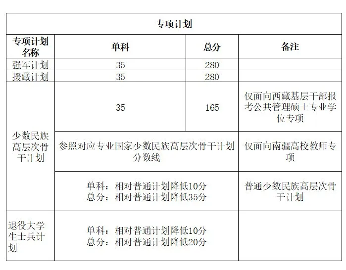 符合條件并申請享受少數(shù)民族照顧政策的考生(指工作單位和戶籍在國務(wù)院公布的民族區(qū)域自治地方,且定向就業(yè)單位為原單位的少數(shù)民族在職人員考生),總分相較報考專業(yè)普通計劃降10分,單科不變。