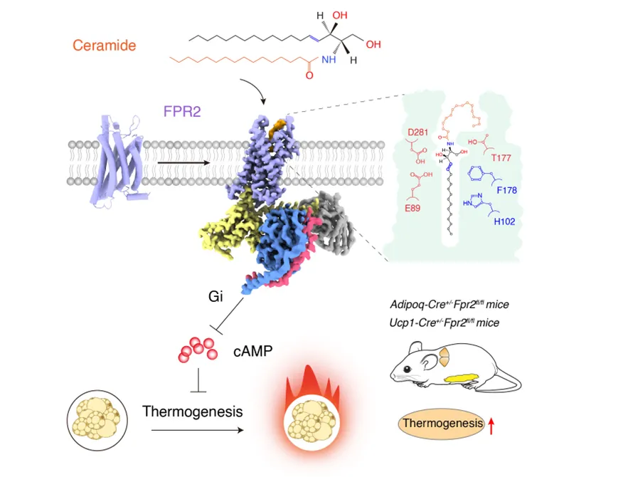 該研究首次發(fā)現(xiàn)了脂肪細(xì)胞中的神經(jīng)酰胺膜受體FPR2,系統(tǒng)闡明了神經(jīng)酰胺-FPR2信號軸調(diào)控脂肪產(chǎn)熱的作用機制,揭示了FPR2特異性識別神經(jīng)酰胺的分子機制。這項突破性工作不僅為深入理解神經(jīng)酰胺的生物學(xué)功能提供了全新視角,更為代謝性疾病的靶向治療開辟了新的研究方向。