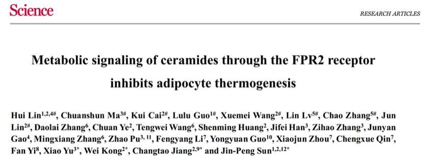 3月14日,山東大學(xué)基礎(chǔ)醫(yī)學(xué)院孫金鵬教授團隊,聯(lián)合北京大學(xué)醫(yī)學(xué)部基礎(chǔ)醫(yī)學(xué)院姜長濤教授和孔煒教授團隊、山東大學(xué)于曉教授團隊,在《科學(xué)》(Science)在線發(fā)表研究論文“Metabolic signaling of ceramides through the FPR2 receptor inhibits adipocyte thermogenesis”。