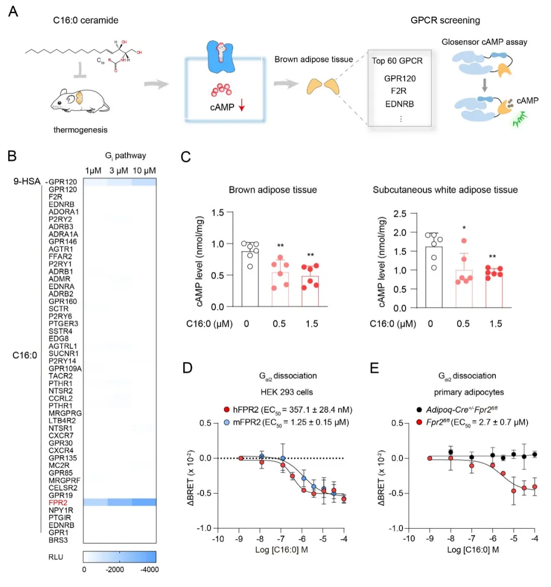神經(jīng)酰胺作為鞘磷脂代謝核心分子,其異常累積與糖尿病、肥胖及動脈粥樣硬化等代謝疾病密切相關(guān)。研究團隊發(fā)現(xiàn)神經(jīng)酰胺可能通過一種Gi偶聯(lián)的GPCR調(diào)控脂肪產(chǎn)熱,利用GPCR高靈敏多通路信號檢測系統(tǒng),鑒定出FPR2是脂肪細(xì)胞中Gi偶聯(lián)的神經(jīng)酰胺受體。通過基因敲除和拮抗劑實驗證實C16:0神經(jīng)酰胺通過激活FPR2受體抑制脂肪產(chǎn)熱。
