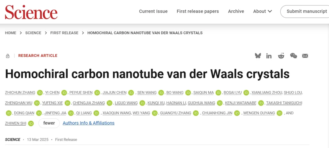 近日,上海交通大學(xué)物理與天文學(xué)院史志文教授、梁齊教授與合作者在《Science》上發(fā)表題為“Homochiral carbon nanotube van der Waals crystals”的研究論文,論文以First Release的形式在Science網(wǎng)站提前在線發(fā)表。該研究開(kāi)發(fā)了一種制備碳納米管陣列的全新方法,成功實(shí)現(xiàn)了單一手性平行密排碳納米管陣列的直接生長(zhǎng),首次得到了碳納米管范德華晶體結(jié)構(gòu),并演示了所制備的碳納米管陣列可用于制造高性能場(chǎng)效應(yīng)晶體管器件。