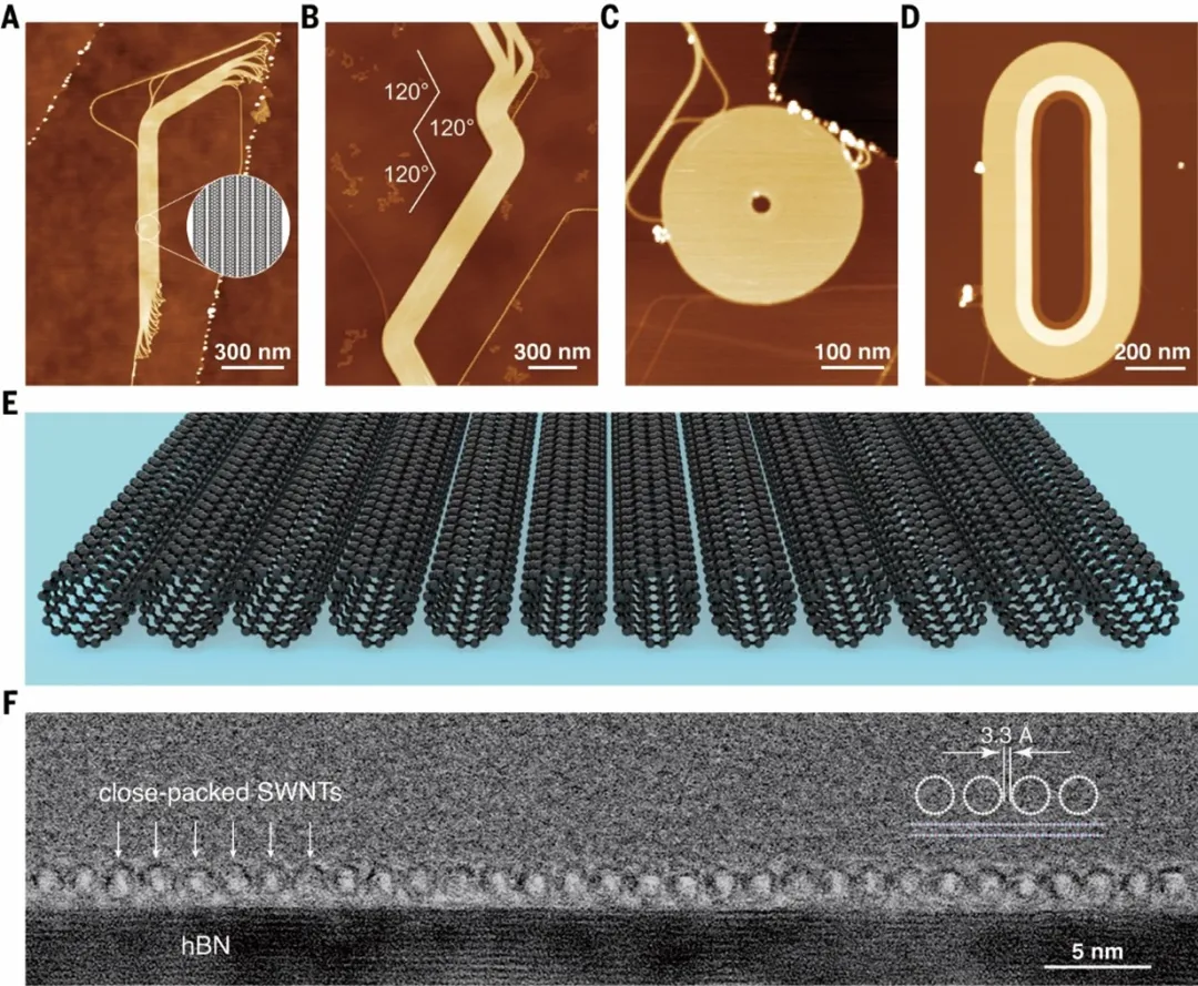 碳納米管陣列晶體是通過(guò)一種納米顆粒催化的化學(xué)氣相沉積(CVD)生長(zhǎng)技術(shù)實(shí)現(xiàn)的。實(shí)驗(yàn)觀測(cè)發(fā)現(xiàn),生長(zhǎng)得到的碳納米管陣列均由同一手性的碳納米管組成,碳納米管之間相互平行、緊密排列,間距為固定的0.33 nm。理論分析揭示,這種近乎完美的陣列結(jié)構(gòu)的形成源自于碳納米管與六方氮化硼基底之間的超潤(rùn)滑摩擦特性及碳納米管間的范德華相互作用:生長(zhǎng)出的碳納米管可以在基底上自由滑動(dòng),找到能量更低的構(gòu)型,反復(fù)折疊排列在一起,并最終自組裝形成范德華晶體結(jié)構(gòu)。