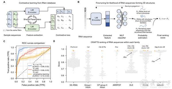 圖2:CRAFTS的性能評(píng)估,分析RNA家族結(jié)構(gòu)特征。A. 對(duì)比學(xué)習(xí)用于確定輸入對(duì)是否屬于同一RNA家族。 B. 微調(diào)模型以從每個(gè)RNA家族的序列中提取結(jié)構(gòu)特征。 C基準(zhǔn)數(shù)據(jù)性能表現(xiàn):平均ROC曲線及標(biāo)準(zhǔn)差(基于5折交叉驗(yàn)證)。D. 對(duì)5S rRNA、I類內(nèi)含子、CP II類內(nèi)含子等家族分析。通過實(shí)驗(yàn)結(jié)構(gòu)測定驗(yàn)證的序列以橙色標(biāo)注。