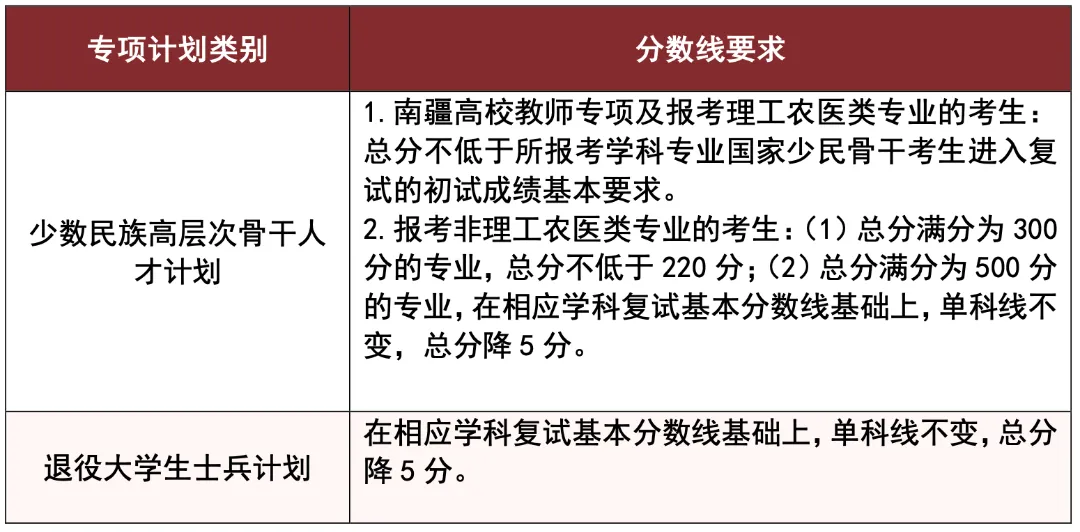 3.我校少數(shù)民族照顧政策按照教育部《2025年全國碩士研究生招生工作管理規(guī)定》執(zhí)行。工作單位在國務(wù)院公布的民族區(qū)域自治地方,且定向就業(yè)原單位的少數(shù)民族在職人員考生,申請享受照顧政策的,須在網(wǎng)上報名時按要求填報相關(guān)信息。未按規(guī)定申報或?qū)徍宋赐ㄟ^的,不享受照顧政策。學(xué)校將根據(jù)考生材料和有關(guān)部門反饋的名單進行審核。審核通過者可在相應(yīng)普通計劃學(xué)科分?jǐn)?shù)線基礎(chǔ)上總分降5分或一門單科降5分,考生在享受照顧政策后,分?jǐn)?shù)不得低于享受少數(shù)民族照顧政策國家線有關(guān)要求。