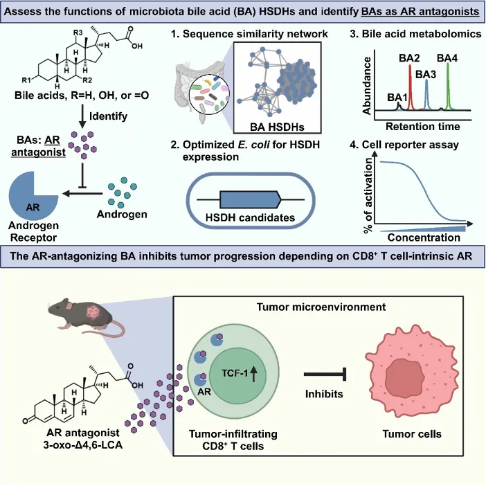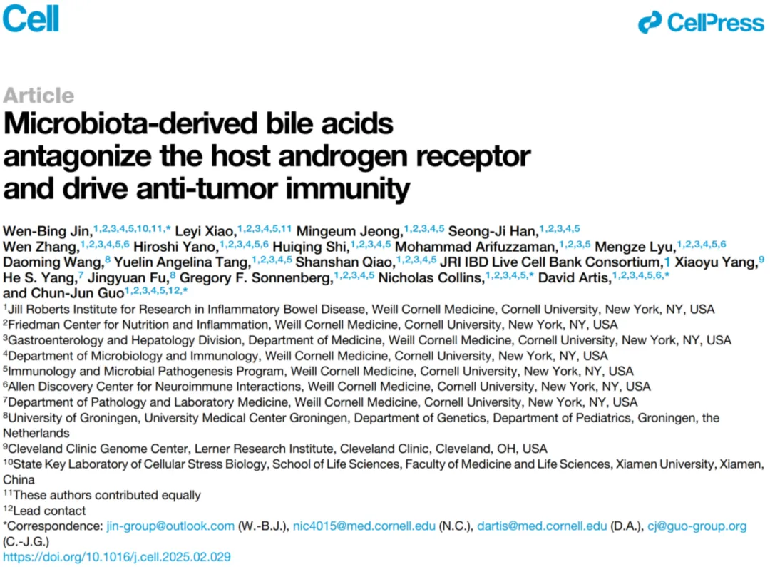 近日,廈門大學(xué)生命科學(xué)學(xué)院金文兵教授團(tuán)隊(duì)在國(guó)際頂級(jí)期刊Cell上發(fā)表論文。該研究揭示了:腸道微生物產(chǎn)生的新型膽汁酸可以通過拮抗雄激素受體,從而調(diào)節(jié)腫瘤免疫!