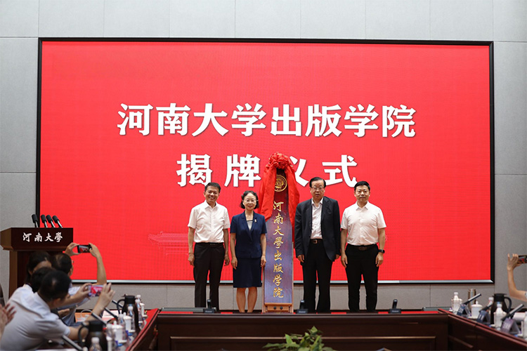 儀式上,中共河南省委宣傳部副部長、一級(jí)巡視員賈宏宇,中國編輯學(xué)會(huì)會(huì)長、中國新聞出版研究院原院長郝振省,中國新聞史學(xué)會(huì)編輯出版史專業(yè)委員會(huì)理事長、武漢大學(xué)原副校長吳平,河南大學(xué)黨委書記季波共同為“河南大學(xué)出版學(xué)院”揭牌。