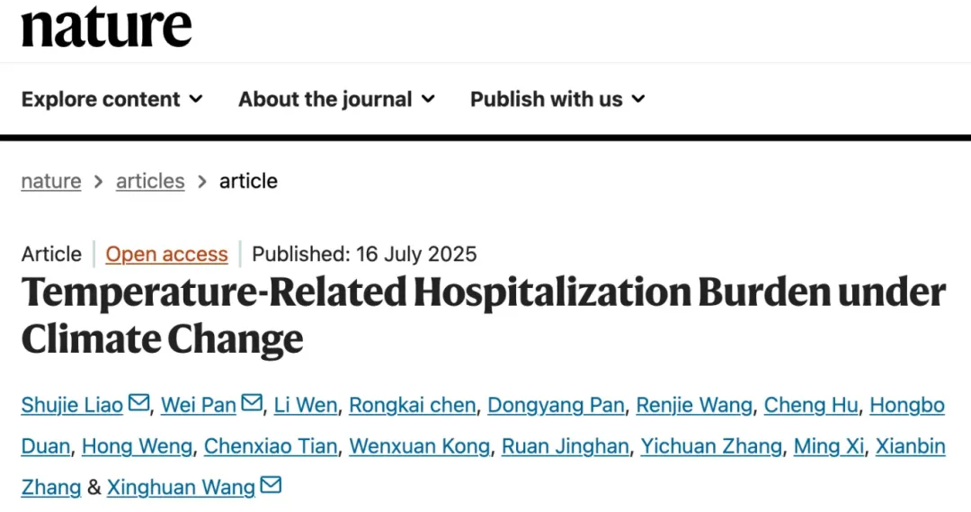 北京時間7月16日,Nature在線發(fā)表了武漢大學王行環(huán)教授團隊關(guān)于氣候變化背景下與溫度相關(guān)的住院負擔的最新研究成果,論文題為“Temperature-Related Hospitalization Burden under Climate Change”。論文第一完成單位為武漢大學。
