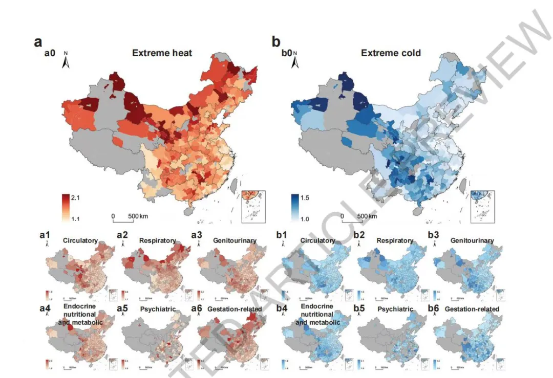 ▲溫度對醫(yī)院住院的影響(a、b)極端高溫(a)和極端低溫(b)對 中國城市在 95%和 5%氣溫百分位數(shù)下的醫(yī)院住院的相對風險。島狀區(qū)域被劃為南中國海島嶼。基礎(chǔ)地圖的數(shù)據(jù)來源于中國自然資源部監(jiān)管的標準地圖服務(wù)平臺(http://bzdt.ch.mnr.gov.cn )。基礎(chǔ)地圖的批準編號為 2023(2767)。地圖上的灰色區(qū)域表示無數(shù)據(jù)的區(qū)域。