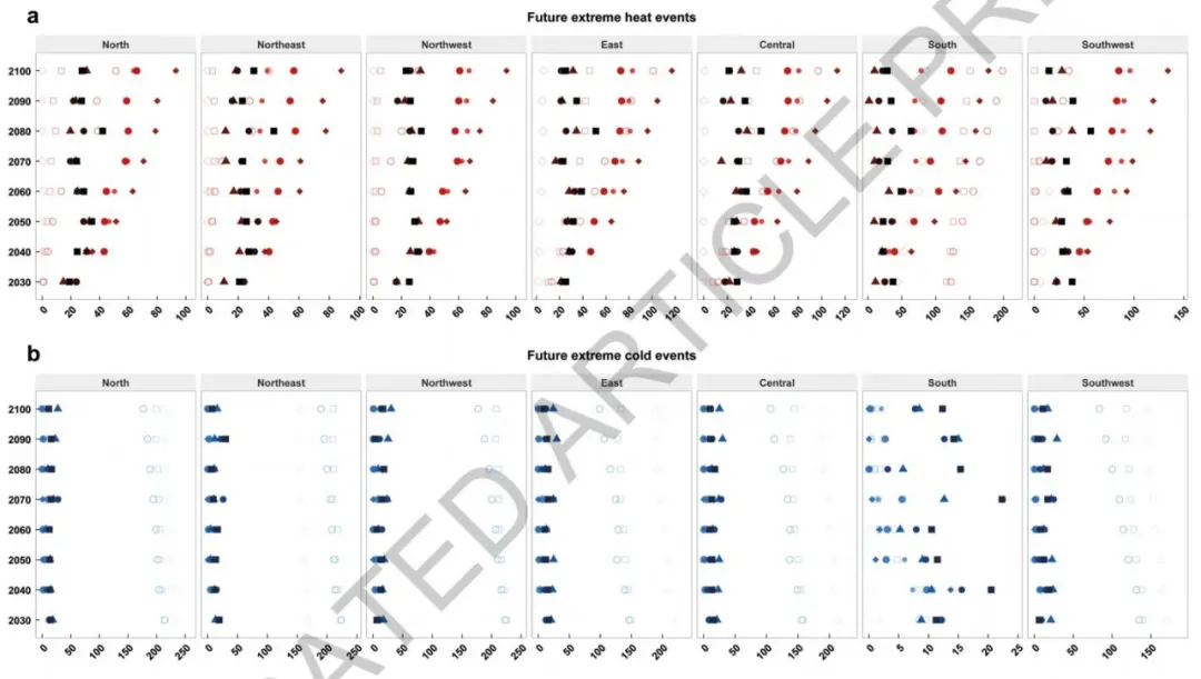 ▲極端高溫和低溫事件發(fā)生頻率的未來變化(a)表示極端高溫事件的年發(fā)生頻率,而(b)則表示極端低溫事件的頻率。