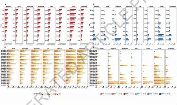 ▲當前溫度閾值門檻計算下,未來各年與極端高溫和極端低溫相關(guān)的地區(qū)住院風險增加情況(2030 - 2100 年)(a、b)未來極端高溫和極端低溫事件的住院風險在三種排放情景下的情況。(c、d)在三種排放情景下,未來三個年齡組中發(fā)生的極端高溫和極端低溫事件的住院風險增加情況。