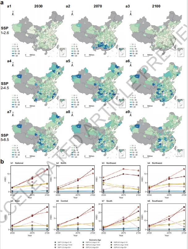 ▲未來與高溫相關(guān)的住院醫(yī)療負擔(a)2030年、2070年和2100年中國高溫相關(guān)住院經(jīng)濟負擔指數(shù)(HBEI),反映因城市極端高溫導(dǎo)致的額外住院費用占GDP的比例。地圖中灰色區(qū)域表示數(shù)據(jù)缺失的地區(qū)。(b)不同年齡組及各地區(qū)的高溫相關(guān)HBEI。