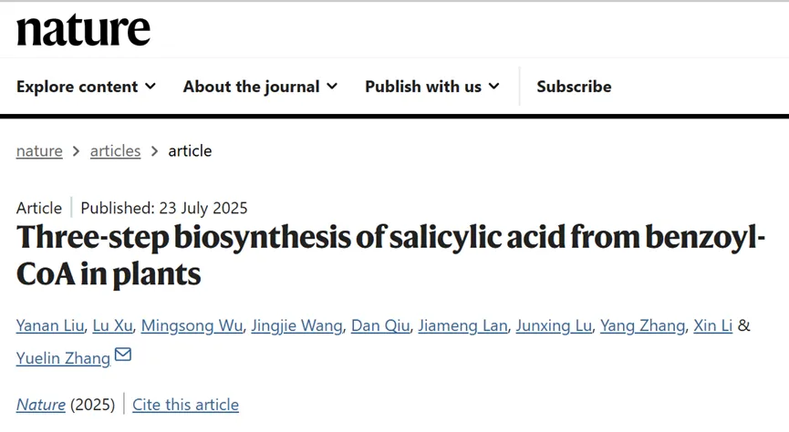 7月23日,四川大學(xué)生命科學(xué)學(xué)院張躍林教授團隊在國際頂尖期刊Nature發(fā)表題為“Three-step biosynthesis of salicylic acid from benzoyl-CoA in plants”的突破性研究,首次完整解析植物中一條全新的水楊酸合成通路“PAL/BSH途徑”,并證明該通路在種子植物中廣泛存在且高度保守。四川大學(xué)生命科學(xué)學(xué)院劉亞楠副研究員和英屬哥倫比亞大學(xué)徐璐博士為論文共同第一作者,張躍林教授為通訊作者。四川大學(xué)張陽教授和英屬哥倫比亞大學(xué)李昕教授對該研究提出了重要建議和幫助。該研究得到了國家自然科學(xué)基金、四川省自然科學(xué)基金等項目資助。論文中涉及的水楊酸及其前體等化合物測試主要在四川大學(xué)生命科學(xué)學(xué)院質(zhì)譜平臺王晞華博士幫助下完成。