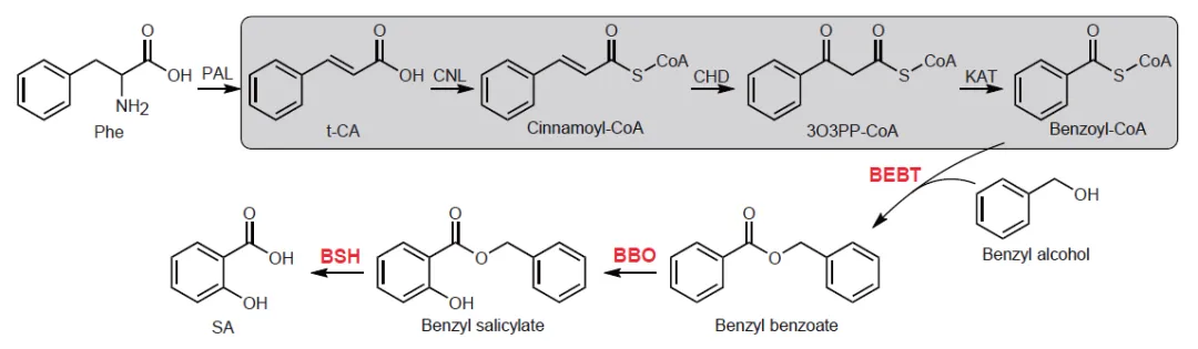 張躍林團隊采用多學(xué)科攻堅策略,結(jié)合化學(xué)遺傳篩選、轉(zhuǎn)錄組學(xué)、CRISPR基因編輯及精準代謝分析,在本氏煙草中成功捕捉到PAL途徑的全貌。研究揭示了一條意想不到的三步酶促反應(yīng)(圖1):(1)酯化啟動:苯甲酰輔酶A:苯甲醇苯甲酰轉(zhuǎn)移酶(BEBT)催化苯甲酰輔酶A與苯甲醇結(jié)合,生成苯甲酸芐酯。(2)羥基化轉(zhuǎn)化:苯甲酸芐酯氧化酶(BBO)對苯甲酸芐酯進行羥基化,生成水楊酸芐酯。(3)水解釋放:水楊酸芐酯水解酶(BSH)裂解水楊酸芐酯,最終釋放出水楊酸(SA)。