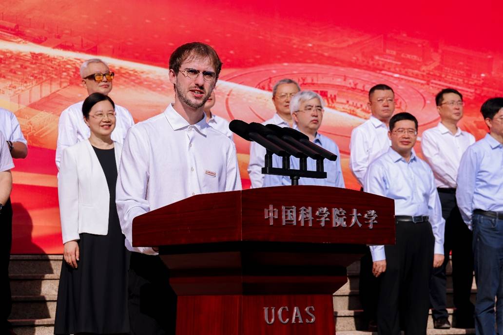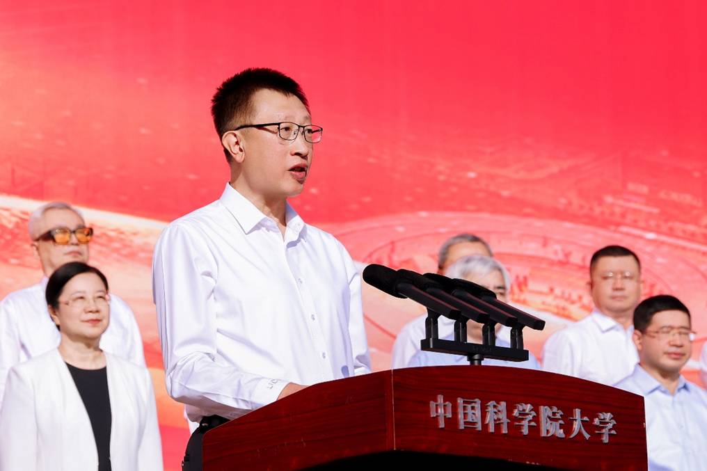 周琪發(fā)表題為“銘記歷史 開創(chuàng)未來”的致辭。他以70年前正式頒布《中國科學(xué)院研究生暫行條例》為例,介紹了中國科學(xué)院科教融合的育人傳統(tǒng),以及國科大正在探索的自主人才培養(yǎng)模式;以60年前科學(xué)家建議開展人造衛(wèi)星研制和世界上首次成功人工合成牛胰島素為例,講述了錢學(xué)森、趙九章等老先生們集智攻關(guān)、科技報國的精神傳承;以50年前中國科學(xué)院與德國馬普學(xué)會簽署合作協(xié)議為例,強調(diào)國際交流的本質(zhì)是人與人的交流,希望同學(xué)們和留學(xué)生同學(xué)攜手并進(jìn),深刻理解并踐行“人類命運共同體”理念。他勉勵新生從學(xué)校的奮斗史中汲取力量,以前輩為榜樣,賡續(xù)“兩彈一星”精神,讀懂國科大人的使命,立足實際,解決國家最迫切需要解決的根本性難題。
