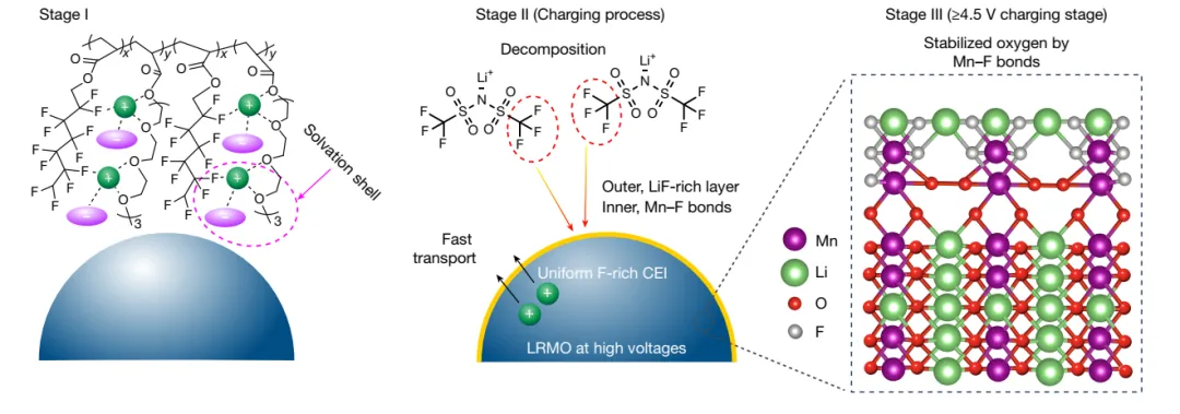 針對以上挑戰(zhàn),研究團隊提出了“富陰離子溶劑化結構”設計新策略,成功開發(fā)出一種新型含氟聚醚電解質(zhì)。該電解質(zhì)有效增強了固態(tài)界面的物理接觸與離子傳導能力,并顯著提升了界面穩(wěn)定性。