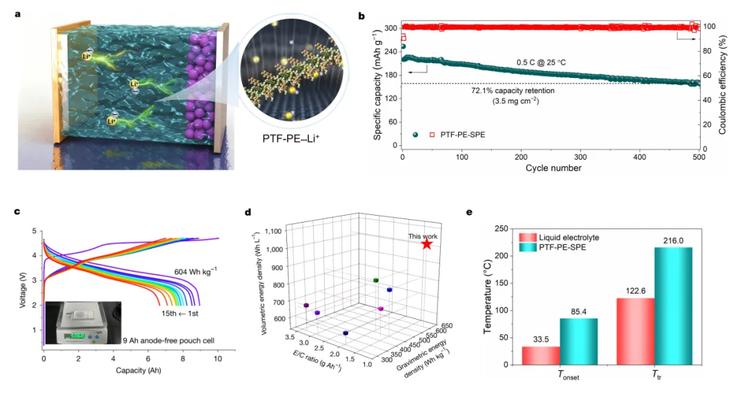 當前,電動汽車、電動飛行器、人形機器人等前沿領域?qū)恿ο到y(tǒng)提出了高能量、高安全需求,開發(fā)兼具高能量密度和優(yōu)異安全性能的電池器件已成為當前儲能領域的核心挑戰(zhàn)。記者從清華大學獲悉,該?;は祻垙娊淌趫F隊成功開發(fā)出一種新型含氟聚醚電解質(zhì),構筑出能量密度達604 Wh kg-1的高安全聚合物電池,解開了鋰電池續(xù)航與安全不可兼得的難題。該研究為開發(fā)實用化的高安全性、高能量密度固態(tài)鋰電池提供了新思路與技術支撐。相關成果日前在線發(fā)表于國際期刊《自然》。