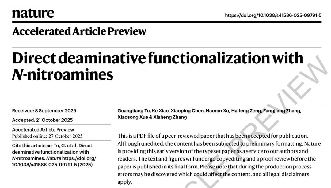 北京時間10月28日,國際權威期刊Nature發(fā)表了國科大杭州高等研究院(以下簡稱“杭高院”)化學與材料科學學院(以下簡稱“化材學院”)研究員張夏衡團隊最新成果——“Direct deaminative functionalization with N-nitroamines”。該成果受到Nature四位主審稿人的高度評價,作為審稿人之一的國際制藥巨頭輝瑞公司高級研發(fā)總監(jiān)Scott Bagley給予評價:“true tour de force”(法語:真正的杰作)。